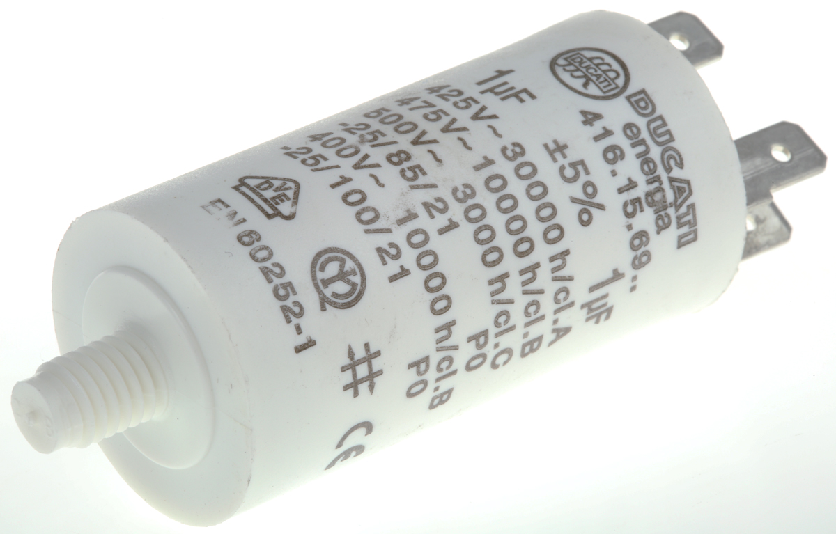 This is 1μF Polypropylene Capacitor PP 500V ac ±5% Tolerance Stud Mount 4.16.15 Series manufactured by Ducati Energia. The manufacturer part number is 4.16.15.69.64. The given dimensions of the product include 28 (dia.) x 55mm. The product is available in stud mount configuration. The product 4.16.15, is a highly preferred choice for users. In addition, the height is 55mm. It provides a 1µf of capacitance value. It carries a 500v ac of voltage. It features ±5% of tolerance value. The dielectric options include polypropylene.