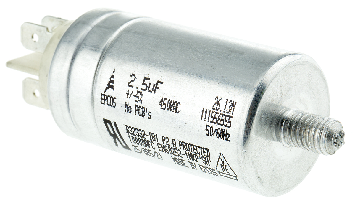 This is 2.5μF Polypropylene Capacitor PP 450V ac ±5% Tolerance Stud Mount B32332 Series manufactured by EPCOS. The manufacturer part number is B32332I6255J081. The given dimensions of the product include 25 (dia.) x 50mm. The product is available in stud mount configuration. The product b32332, is a highly preferred choice for users. In addition, the height is 50mm. It provides a 2.5µf of capacitance value. It carries a 450v ac of voltage. Whereas, the minimum operating temperature of the product is -25°c. It has a maximum operating temperature of +85°c. It features ±5% of tolerance value. The terminal is a stud mount type. The dielectric options include polypropylene.