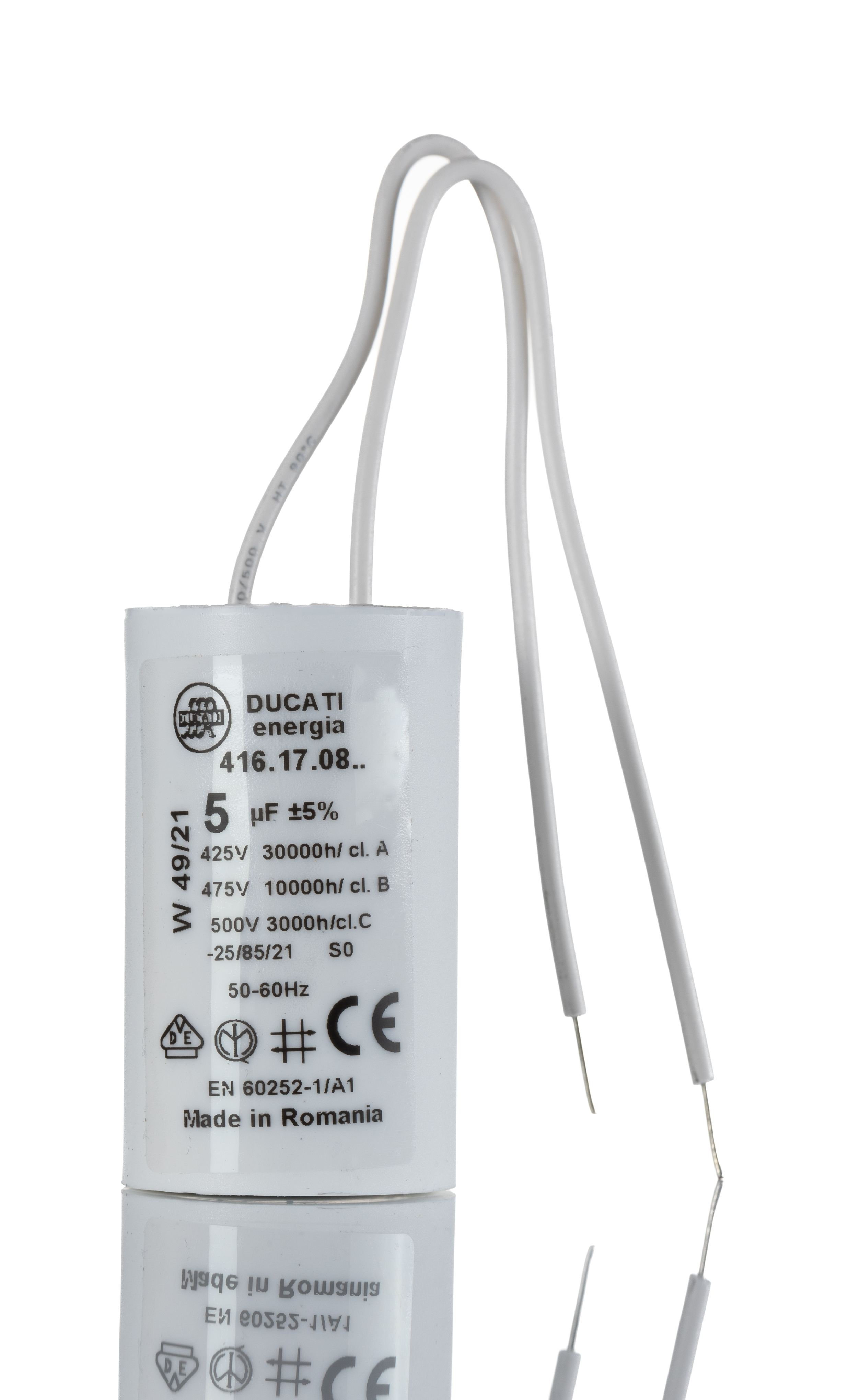 This is 5μF Polypropylene Capacitor PP 400 → 450V ac ±5% Tolerance Plug In 4.16.17 Series manufactured by Ducati Energia. The manufacturer part number is 4.16.17.08.06. The given dimensions of the product include 32 x 55mm. The product is available in plug in configuration. The product 4.16.17, is a highly preferred choice for users. It provides a dissipation factor of <20%. In addition, the height is 55mm. It provides a 5µf of capacitance value. It carries a 400 → 450v ac of voltage. Whereas, the minimum operating temperature of the product is -25°c. The lead is 2.8mm long. It has a maximum operating temperature of +85°c. It features ±5% of tolerance value. The terminal is a faston type. The dielectric options include polypropylene.