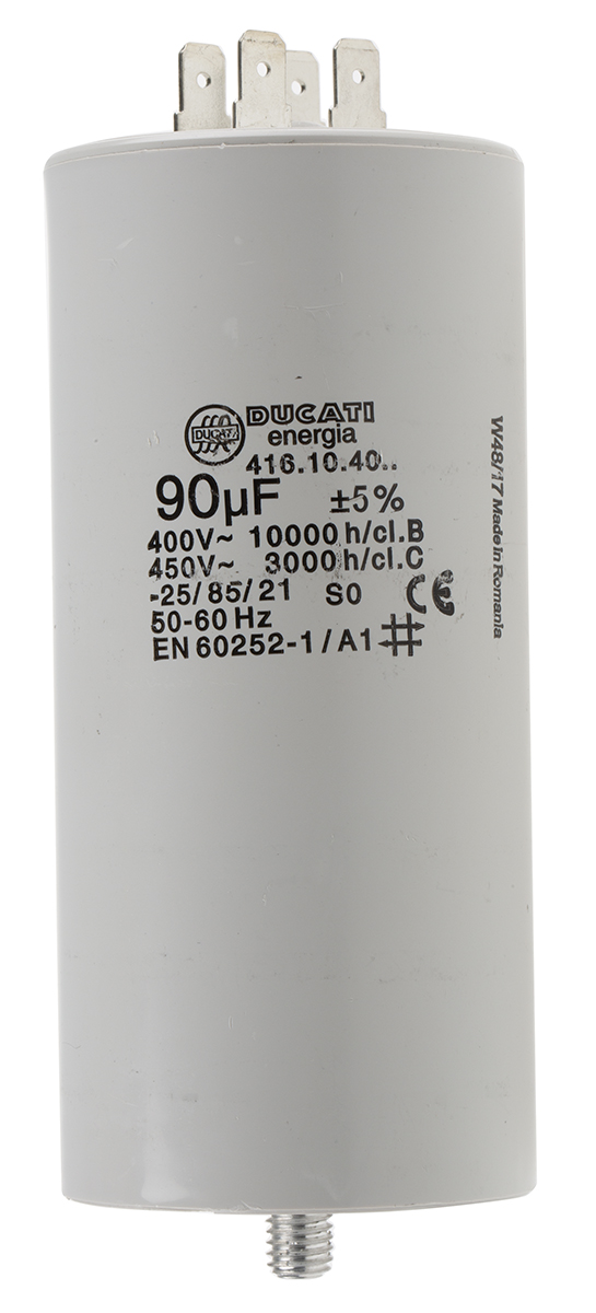 This is 90μF Power Electronic Capacitors (PEC) 450V ac ±5% Tolerance Stud Mount 4.16.10 Series manufactured by Ducati Energia. The manufacturer part number is 4.16.10.40.64. It is a c suppression class. The product is available in stud mount configuration. The product 4.16.10, is a highly preferred choice for users. It provides a dissipation factor of 20%. It provides a 90µf of capacitance value. It carries a 450v ac of voltage. Whereas, the minimum operating temperature of the product is -25°c. The dielectric options include polypropylene. It has a maximum operating temperature of +85°c. It features ±5% of tolerance value. The terminal is a faston type.