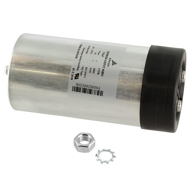 This is manufactured by EPCOS - TDK Electronics. The manufacturer part number is B25620C0757K881. 900v of DC voltage rating. It is assigned with possible HTSUS value of 8532.25.0080. The product is rohs3 compliant. It carries ESR (Equivalent Series Resistance) of 1.1 mohms. It provides a 750 µf of capacitance value. The product has -55°c ~ 85°c operating temperature range. Moreover, the product comes in radial, can. It features ±10% of tolerance value. It has the maximum seated height of 7.126" (181.00mm). Moreover, the product is constructed from highly polypropylene (pp), metallized dielectric material. In addition, it is reach unaffected. The product is widely employed in dc link, dc filtering. The product's diameters include 3.346" dia (85.00mm). The product features threaded, female termination style. It has a long 22 weeks standard lead time. Its typical moisture sensitivity level is not applicable. The product is available in chassis, stud mount configuration. The product mkp dc link, is a highly preferred choice for users. In addition, bulk is the available packaging type of the product. It is assigned with 1.969" (50.00mm) of lead spacing. The product is designated with the ear99 code number.