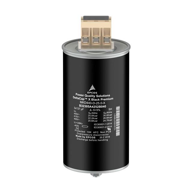 This is manufactured by EPCOS - TDK Electronics. The manufacturer part number is B32305A4302B040. It is assigned with possible HTSUS value of 8532.25.0020. The product is rohs3 compliant. It provides a 165 µf of capacitance value. The product has -40°c ~ 65°c operating temperature range. Moreover, the product comes in radial, can. It features ±5% of tolerance value. It has the maximum seated height of 10.925" (277.50mm). Moreover, the product is constructed from highly polypropylene (pp) dielectric material. The product exhibits 440v of AC voltage rating. In addition, it is reach unaffected. The product is widely employed in 3 phase, power factor correction (pfc). The product's diameters include 5.472" dia (139.00mm). The product features terminal block termination style. Its typical moisture sensitivity level is not applicable. The product is available in chassis, stud mount configuration. The product deltacap™ b32305a, is a highly preferred choice for users. In addition, bulk is the available packaging type of the product. It is assigned with 0.669" (17.00mm) of lead spacing. The product is designated with the ear99 code number.