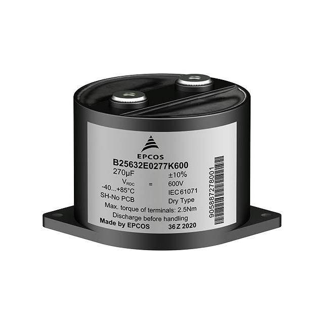This is manufactured by EPCOS - TDK Electronics. The manufacturer part number is B25632E0906K900. 900v of DC voltage rating. It is assigned with possible HTSUS value of 8532.25.0080. The product is rohs3 compliant. It carries ESR (Equivalent Series Resistance) of 1 mohms. It provides a 90 µf of capacitance value. The product has -40°c ~ 85°c operating temperature range. Moreover, the product comes in radial, can. It features ±10% of tolerance value. It has the maximum seated height of 2.008" (51.00mm). In addition, it is reach unaffected. The product is widely employed in dc link, dc filtering; snubber. It is shipped in bulk package . The product's diameters include 3.327" dia (84.50mm). The product features threaded, female termination style. Its typical moisture sensitivity level is not applicable. The product is available in chassis mount configuration. The product ultra lsi, is a highly preferred choice for users. It is assigned with 1.772" (45.00mm) of lead spacing. The product is designated with the ear99 code number.