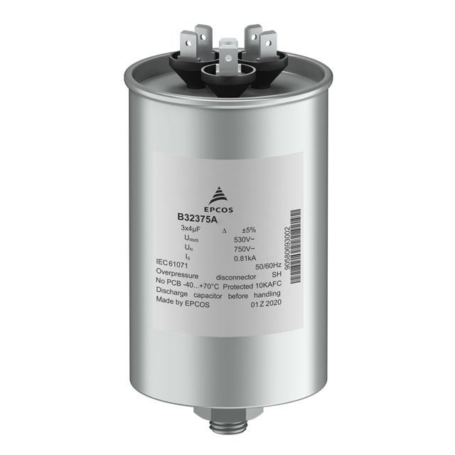 This is manufactured by EPCOS - TDK Electronics. The manufacturer part number is B32375A5106J030. 750v of DC voltage rating. It is assigned with possible HTSUS value of 8532.25.0070. The product is rohs3 compliant. It provides a 10 µf of capacitance value. The product has -40°c ~ 70°c operating temperature range. Moreover, the product comes in radial, can. It features ±5% of tolerance value. It has the maximum seated height of 5.118" (130.00mm). Moreover, the product is constructed from highly polypropylene (pp), metallized dielectric material. The product exhibits 530v of AC voltage rating. In addition, it is reach unaffected. The product is widely employed in 3 phase. It is shipped in bulk package . The product's diameters include 2.500" dia (63.50mm). The product features quick connect, disconnect termination style. It has a long 27 weeks standard lead time. Its typical moisture sensitivity level is not applicable. The product is available in chassis, stud mount configuration. The product mkd ac - three phase delta connection, is a highly preferred choice for users. It is assigned with 0.787" (20.00mm) of lead spacing. The product is designated with the ear99 code number.