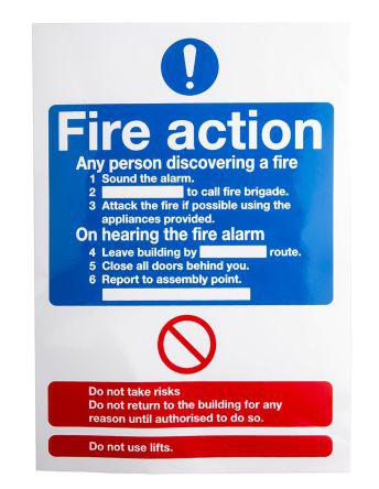 This is Vinyl Fire Safety Sign Fire Safety Sign with English Text Self-Adhesive 148 x 210mm manufactured by RS Pro. The manufacturer part number is 763-1963. Its text message shows fire action instructions . Additionally, it is self-adhesive yes . The product complies with all safety standards, such as iso 7010. It has a label . It has a decent blue/red/white colour. The product is made from highly stable and reliable vinyl. In addition, the height is 210 mm. Furthermore, the product is 148mm wide. It contains 1 item per package . However, its text language is english . In addition, it displays fire action sign description .