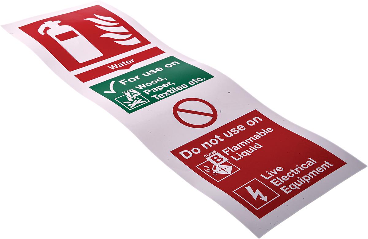 This is Vinyl Fire Safety Sign Fire Equipment Sign with English Text Self-Adhesive 90 x 280mm manufactured by RS Pro. The manufacturer part number is 763-1998. Its text message shows materials extinguisher can be used on . Additionally, it is self-adhesive yes . It has a label . It has a decent green/red/white colour. The product is made from highly stable and reliable vinyl. In addition, the height is 280 mm. Furthermore, the product is 90mm wide. It contains 1 item per package . However, its text language is english . It includes a symbol and text . In addition, it displays water fire extinguisher sign description .