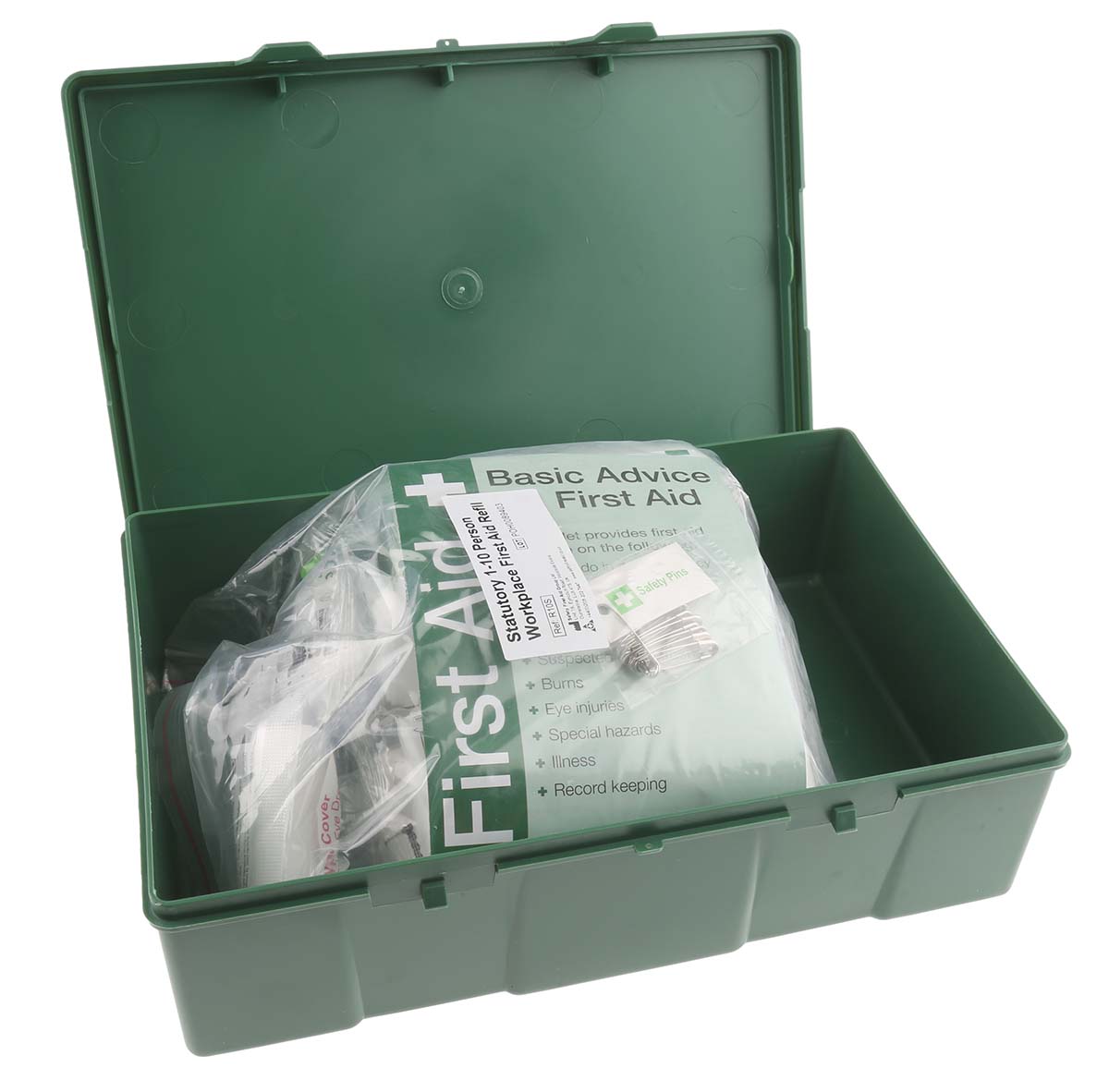 This is Wall Mounted First Aid Kit 510 mm x 290mm x 70 mm manufactured by RS Pro. The manufacturer part number is 764-445. The first aid kit is designed to provide robust applications in a variety of specific settings. It has a wall mounted type case . In addition, the height is 510 mm. In addition, the product's kit/refill contents are bandage, disposable gloves, dressing, eyewash, first aid guide, plasters, safety pins, saline, wipes . Furthermore, the product is 290mm wide. The product comes in 70 mm depth. It has 10 persons maximum served .