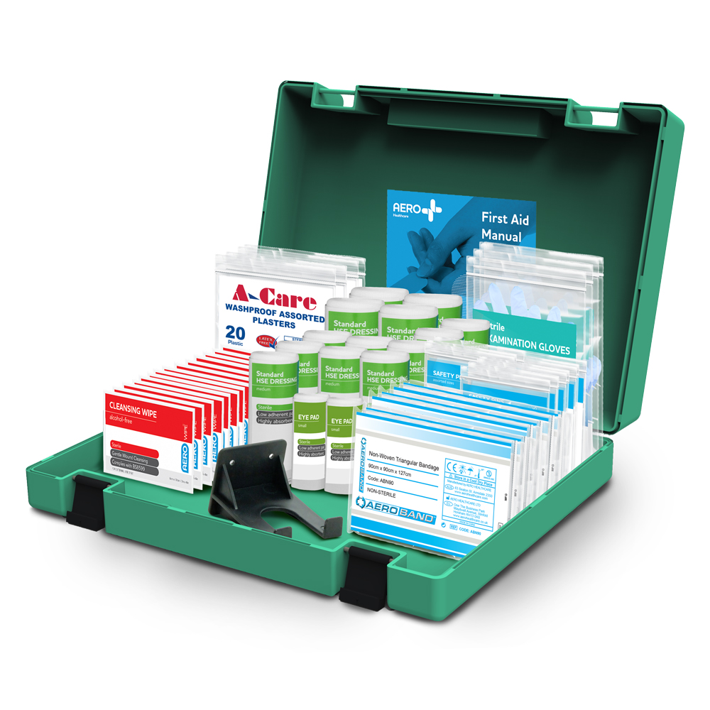 This is First Aid Kit for 50 Person/People Carrying Case manufactured by RS PRO. The manufacturer part number is 279-0887. In addition, the product's kit/refill contents are aerowipe™ sterile saline cleansing wipe x 20, aeroplast™ assorted washproof plasters env/10 x 6, aerowound™ hse dressing 18 x 18cm x 4, aerowound™ hse dressing 12 x 12cm x 12, aerowound™ sterile eye pad with bandage x 6, aeroband™ triangular bandage 90 x 90 x 127cm x 8, aeropin™ nickel plated safety pins x 12 pack, aeroglove™ vinyl examination gloves large x 3 pairs, aeroguide™ a6 first aid leaflet x 1 . The first aid kit is designed to provide robust applications in a variety of specific settings. It has a carrying case type case . It has 50 persons maximum served .