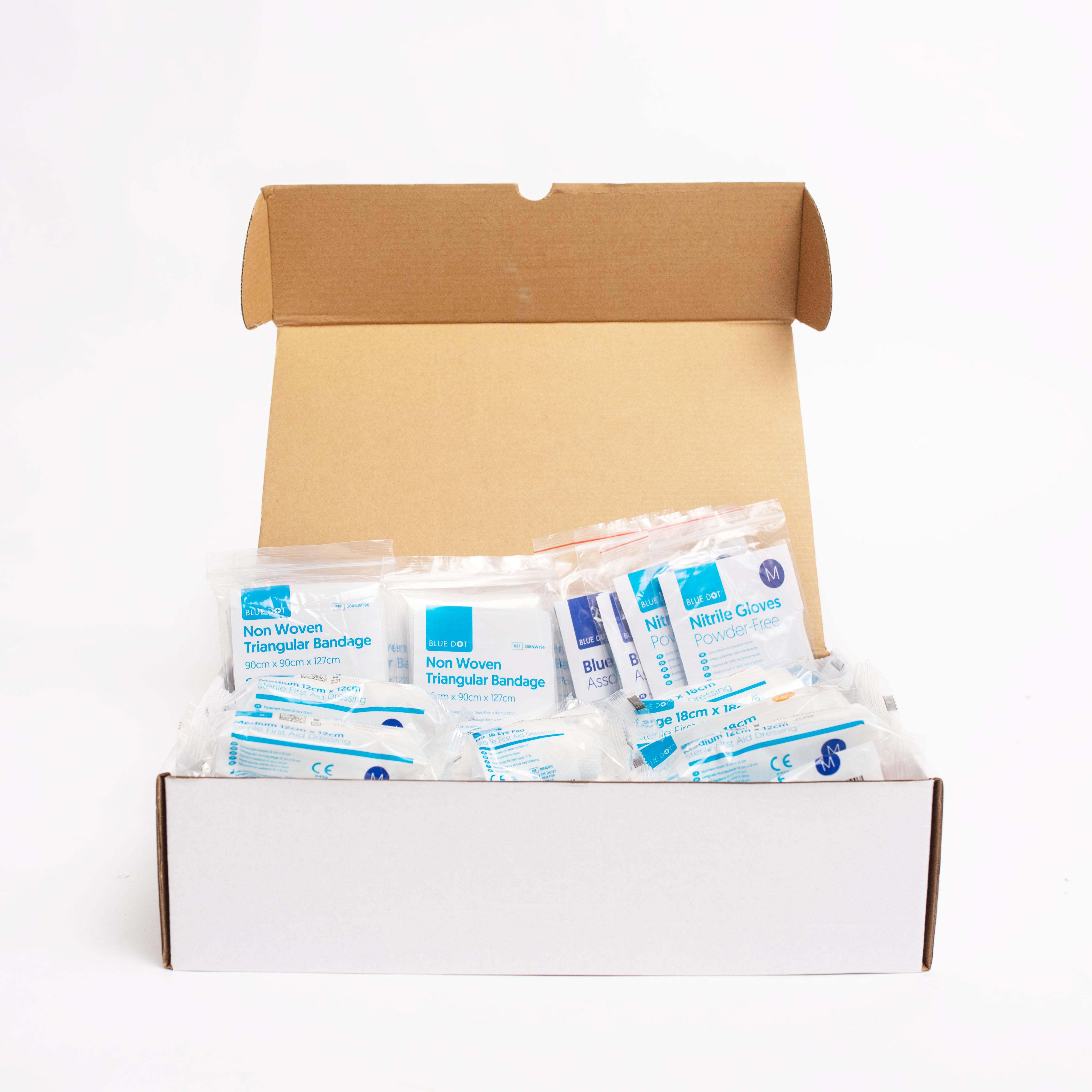 This is Cotton Blue White First Aid Kit 1Each Per Package manufactured by Crest Medical. The manufacturer part number is 50RF. It has a decent blue, white colour. The product is made from highly stable and reliable cotton. It comes in first aid kit configuration. It contains 1each item per package .
