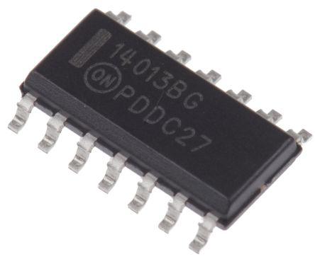 This is Dual D Type Flip Flop IC 3 → 18 V 14-Pin SOIC manufactured by ON Semiconductor. The manufacturer part number is MC14013BDG. While providing inverting, non-inverting polarity. The given dimensions of the product include 8.75 x 4 x 1.5mm. The logic family is 4000. Furthermore, the product is 4mm wide. It carries single ended input type. It provides up to 350 ns @ 5 v maximum propagation delay time. While its minimum operating supply voltage is 3 v. The package is a sort of soic. It consists of 2 elements per chip. It has a maximum operating temperature of +125 °c. It has a set/reset or yes feature . The output signal is a kind of differential. Its accurate length is 8.75mm. It contains 14 pins. It has 18 v maximum operating supply voltage. The product is available in surface mount configuration. The primary function of logic includes d type. In addition, the height is 1.5mm. Whereas, the minimum operating temperature of the product is -55 °c. It is tailored with a positive edge type triggering . Features 50pf of propagation delay test condition.