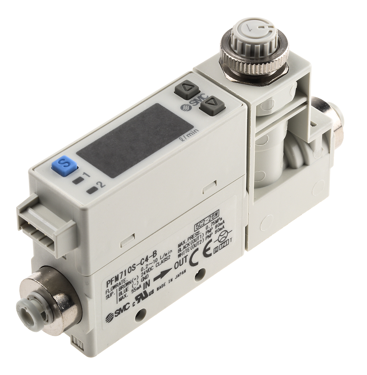 The SMC PFM710S-C4-B-W is a precision air flow meter designed for measuring and monitoring air or gas flow in various industrial applications. It is part of SMC Corporation's comprehensive range of automation and control products known for their accuracy and reliability. Its wide flow range, high precision, compatibility with 24V DC power, and compact design make it a valuable tool for maintaining control and efficiency in various industrial processes.