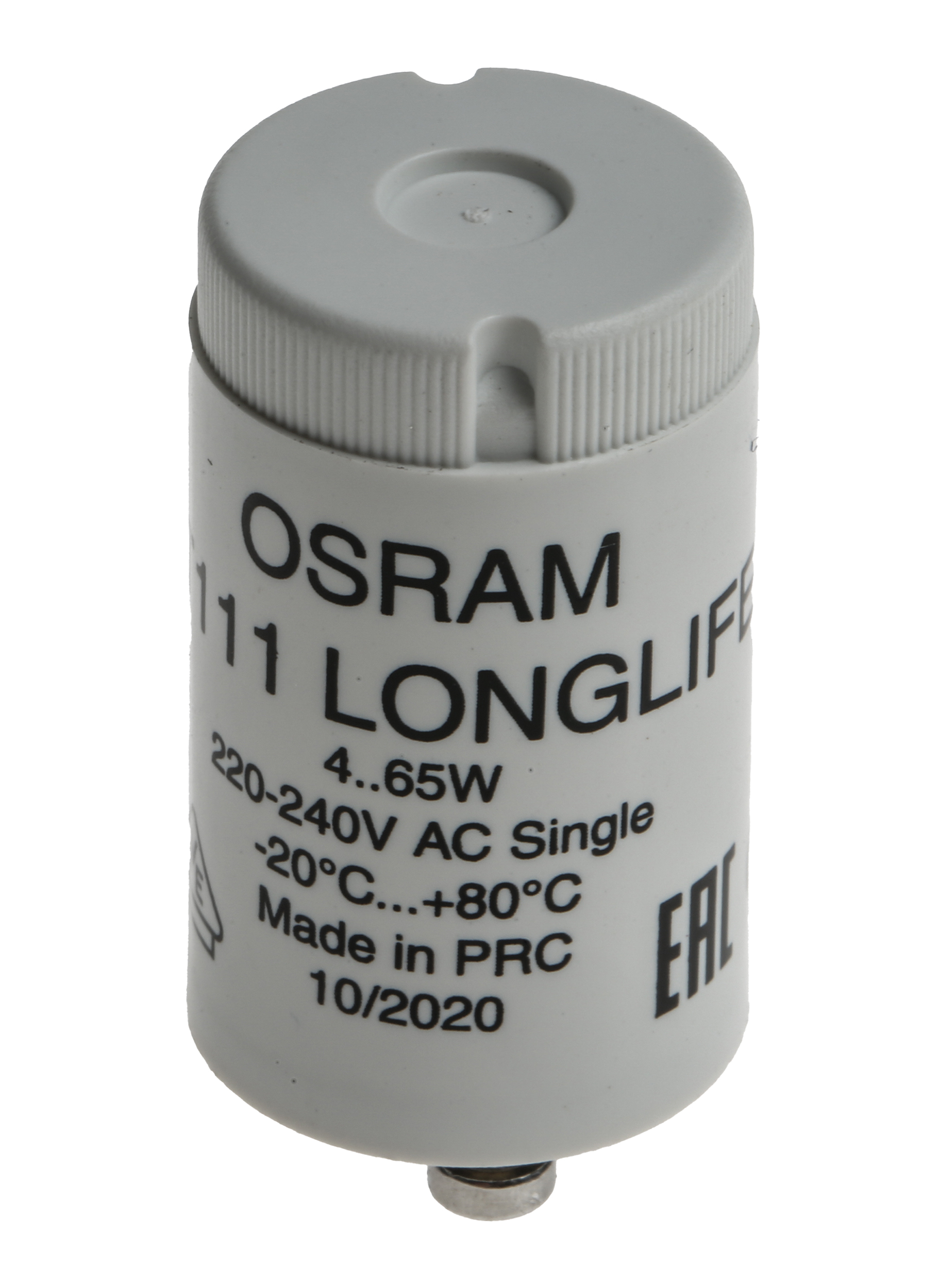 This is ST111LL Glow Fluorescent Light Starter 65 W 220 → 240 V ac 40.3 mm length 21.5mm Diameter manufactured by Osram. The manufacturer part number is 4050300854045. Its diameter is 21.5mm. Moreover, the product has a nominal 220 to 240 v voltage rating. The product st 111 longlife, is a highly preferred choice for users. This product carries 65 w. It includes 1 lamp(s) . Its accurate length is 40.3 mm. It is comprised of 2 pins. It comes in glow configuration.