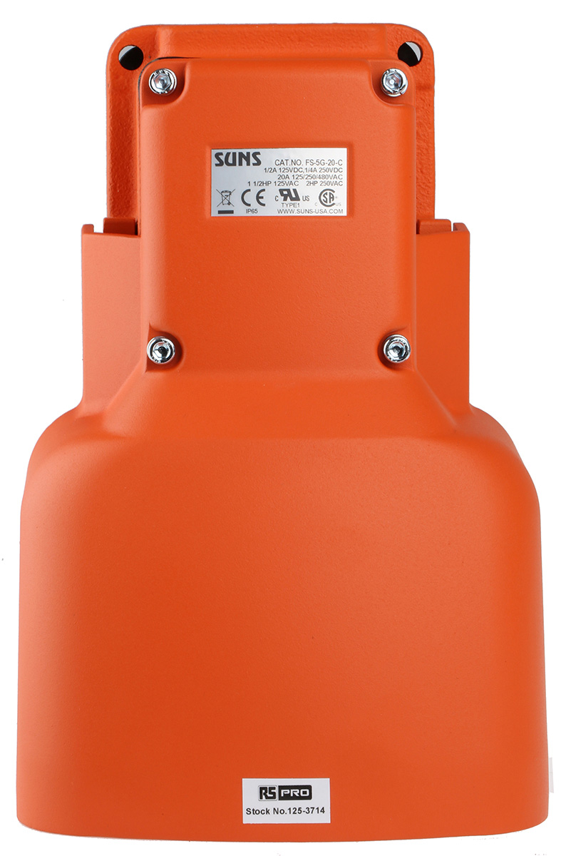 This is Foot Switch Cast Iron Momentary SPDT 20 A 125 V 250 V IP65 manufactured by RS Pro. The manufacturer part number is 125-3714. The product is created for heavy duty switch environment . The given dimensions of the product include 157 x 228 x 140mm. It has about 125v, 250v contact AC voltage rating . It is IP rated with ip65. The rated contact current is 20 a. It has a decent orange colour. The casing is constructed from highly stable cast iron material. In addition, the height is 140mm. It has a/an heavy duty foot switch . Furthermore, the product is 228mm wide. Its accurate length is 157mm. It has a guard cover included yes . It provides momentary switch operation. The contact is equipped with sp-co configuration. The product complies with all safety standards, such as ccc, ce, csa, culus, culus recognised.