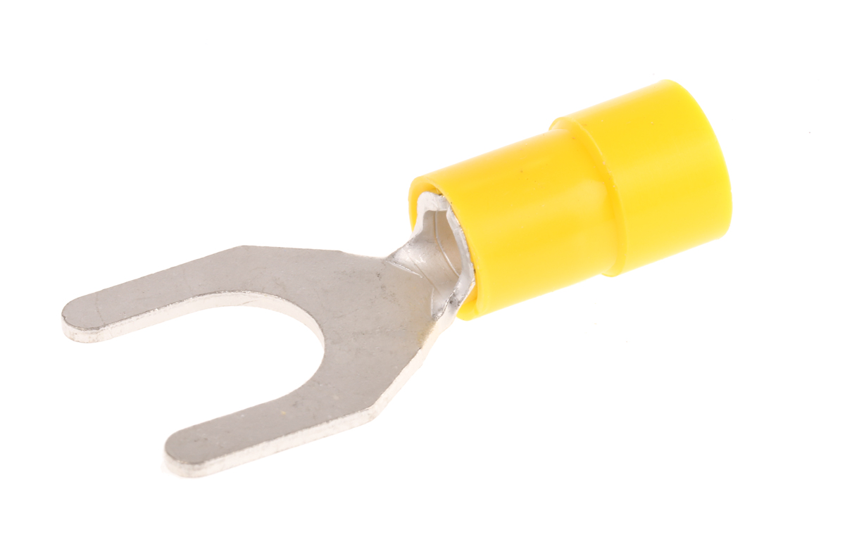 This is Insulated Crimp Spade Connector 4mm² to 6mm² 12AWG to 10AWG M8 Stud Size Vinyl Yellow manufactured by RS Pro. The manufacturer part number is 613-9867. The wire has a maximum size of 6mm². It has a decent yellow colour. While the minimum wire size AWG includes 12awg. It is 1mm thick. It has a standard m8 size stud . Furthermore, the product is 14mm wide. It has a robust vinyl insulation material. The high-quality tin is used as contact plating material. It has an overall length of 30.5mm. Insulation Option: insulated. Its maximum wires size includes 10awg. On the other hand, the wire has 4mm² of minimum size. The product is made from sturdy copper materials.