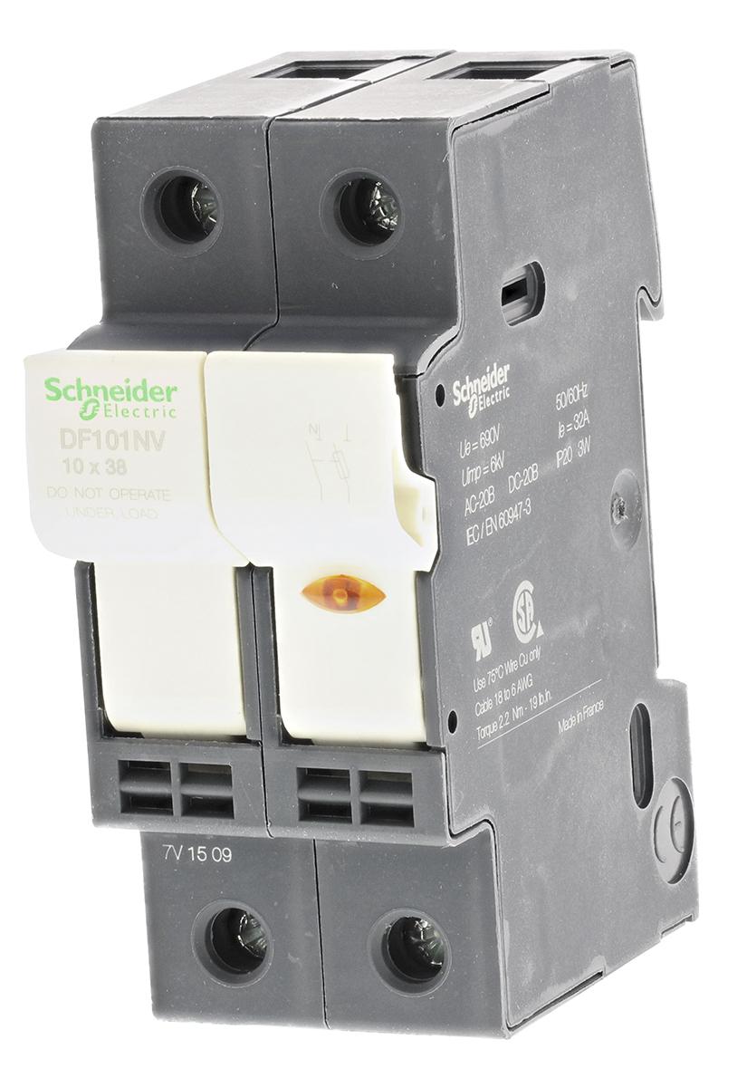 This is 32A Rail Mount Indicating Fuse Holder With Indicator for 10 x 38mm Fuse 690V manufactured by Schneider Electric. The manufacturer part number is DF101NV. The product has a current rating of 32a. Indicator included yes . Moreover, the product has a nominal 690v ac voltage rating. It has din 35 mm type rail . A fuse with a 10 x 38mm size. Moreover, it has a/an rail mount type fuse holder . Its international protection rating is ip20 . It has equipped with 1p+n poles.