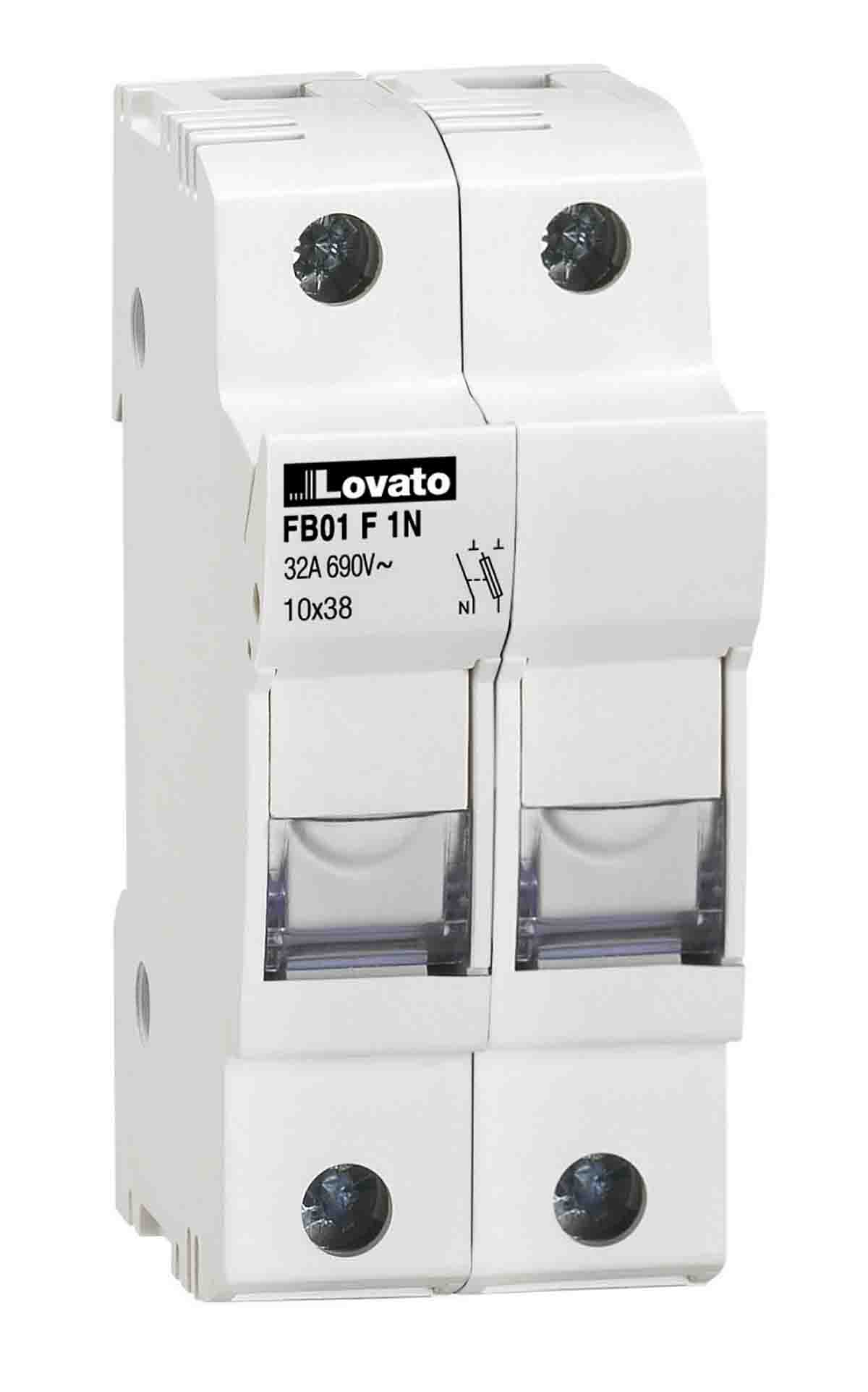 This is FUSE HOLDER 1P+N 10X38 manufactured by Lovato. The manufacturer part number is FB01F1N. The product has a current rating of 32a. Indicator included no . Moreover, the product has a nominal 690v ac voltage rating. It has din 35 mm type rail . Its international protection rating is ip20 . Moreover, it has a/an rail mount type fuse holder . It has equipped with 2p poles.