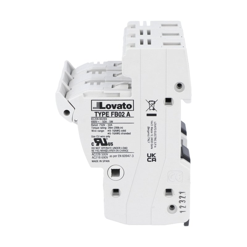 This is FUSE HOLDER 3P 14X51 manufactured by Lovato. The manufacturer part number is FB02A3P. The product has a current rating of 50a. The product complies with all safety standards, such as curus. Indicator included no . Moreover, the product has a nominal 690v ac voltage rating. The product fb, is a highly preferred choice for users. A fuse with a 14 x 51mm size. It has din 35 mm type rail . Its international protection rating is ip20 . It has equipped with 3p poles. Moreover, it has a/an base mount type fuse holder .