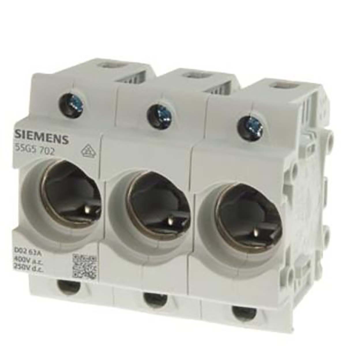 This is 63A 3 Pole D02 Bottle Fuse Holder 400V manufactured by Siemens. The manufacturer part number is 5SG5702. It is compatible with d02 size fuses . The product has a current rating of 63a. Additionally, it has a base bottle fuse holder component . Indicator included no . Moreover, the product has a nominal 400v ac voltage rating. It has din 35 mm type rail . Moreover, it has a/an bottle fuse type fuse holder . It has equipped with 3p poles.