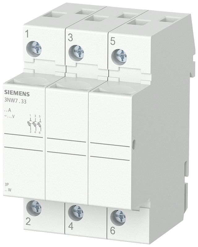This is 32A Rail Mount Fuse Holder for 10 x 38mm Fuse 3P 690V manufactured by Siemens. The manufacturer part number is 3NW7033. The product has a current rating of 32a. The product complies with all safety standards, such as ce. Moreover, the product has a nominal 690v voltage rating. A fuse with a 10 x 38mm size. It features sentron range. It has equipped with 3p poles.