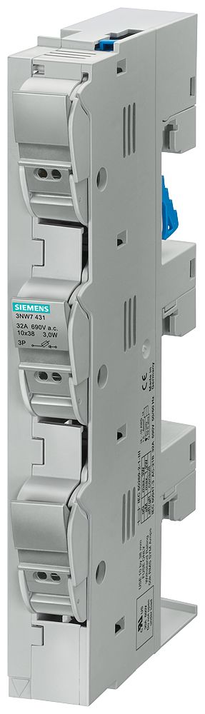 This is 30A Rail Mount Fuse Holder 3P 600V manufactured by Siemens. The manufacturer part number is 3NW7431-0HG. It has equipped with 3p poles. It features sentron range. The product has a current rating of 30a. Moreover, the product has a nominal 600v voltage rating.