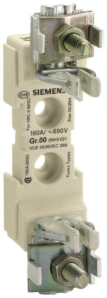 This is 160A Fuse Holder for NH00 Fuse 1P 690V manufactured by Siemens. The manufacturer part number is 3NH3031. The product has a current rating of 160a. Moreover, the product has a nominal 690v voltage rating. Moreover, it has a/an base mount type fuse holder . A fuse with a nh00 size. It features sentron range. It has equipped with 1 poles.