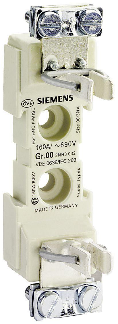 This is 160A Fuse Holder for NH00 Fuse 1P 690V manufactured by Siemens. The manufacturer part number is 3NH3032. The product has a current rating of 160a. Moreover, the product has a nominal 690v voltage rating. Moreover, it has a/an base mount type fuse holder . A fuse with a nh00 size. It features sentron range. It has equipped with 1 poles.