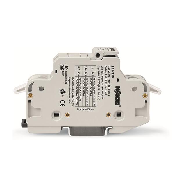 This is manufactured by WAGO Corporation. The manufacturer part number is 811-310. It is assigned with possible HTSUS value of 8536.90.4000. The product is rohs3 compliant. Moreover, it has screw terminal terminal style. In addition, it is reach unaffected. The product is suitable for use with 10mm x 38mm. It is shipped in box package . A fuse with a 0.394" dia x 1.496" l (10mm x 38mm) size. Its typical moisture sensitivity level is not applicable. It has a long 12 weeks standard lead time. It integrates 1 circuits. Additionally, the product's output is 32 a. The product has a horizontal and vertical orientation. The product is available in din rail configuration. holder Fuse holder type. It integrates a cartridge fuse type. It carries a 1000v of voltage. The product is designated with the ear99 code number. The product is made from sturdy copper materials.
