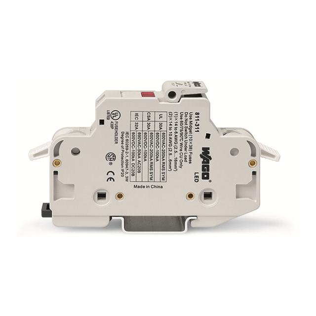 This is manufactured by WAGO Corporation. The manufacturer part number is 811-311. It is assigned with possible HTSUS value of 8536.90.4000. The product is rohs3 compliant. Moreover, it has screw terminal terminal style. In addition, it is reach unaffected. The product is suitable for use with 10mm x 38mm. It is shipped in box package . A fuse with a 0.394" dia x 1.496" l (10mm x 38mm) size. Its typical moisture sensitivity level is not applicable. It has a long 12 weeks standard lead time. It integrates 1 circuits. Additionally, the product's output is 32 a. The product has a horizontal and vertical orientation. The product is available in din rail configuration. holder Fuse holder type. It integrates a cartridge fuse type. It carries a 1000v of voltage. The product is designated with the ear99 code number. The product is made from sturdy copper materials.