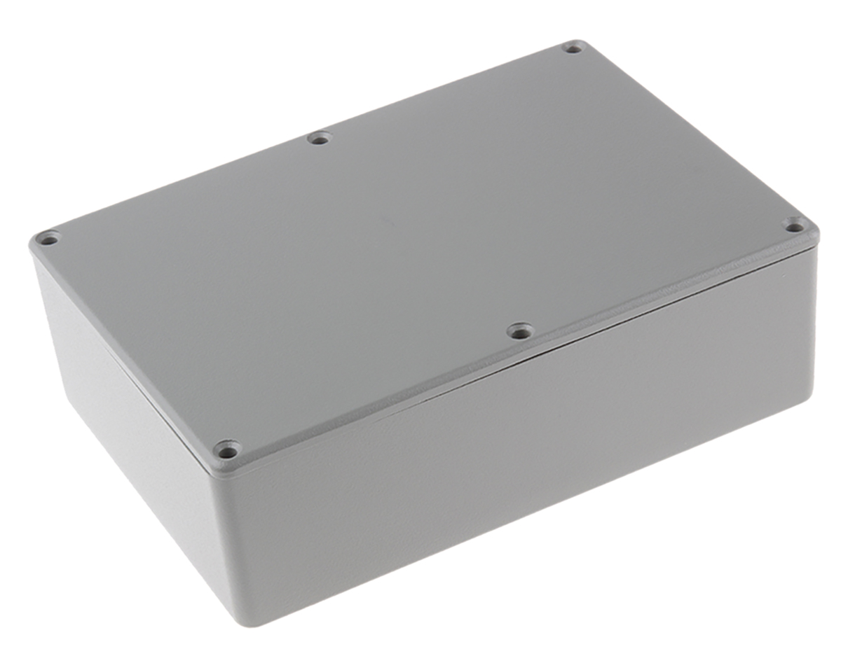 This is Aluminium Enclosure Shielded 171.9 x 120.9 x 55mm manufactured by RS Pro. The manufacturer part number is 517-3850. Flange Options - no. Shielding Options yes. It has a decent grey colour. Its external length includes 171.9 mm. The product's body is nicely designed from die cast aluminium materials. The lid has a classical grey colour. Features 171.9 x 120.9 x 55mm external caliber. While its external height is 55 mm. The product is 120.9 mm wide.