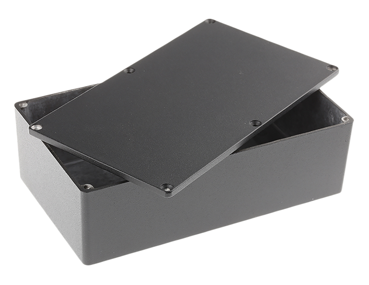 This is 1590 Aluminium Enclosure IP54 Shielded 192 x 111 x 57mm manufactured by Hammond. The manufacturer part number is 1590R1BK. Its RAL code is ral 9005 . Flange Options - no. Its gasket is made using silicone material . The typical product's weight is 450g. It is IP rated with ip54. Shielding Options yes. The product 1590, is a highly preferred choice for users. It has a decent black colour. The product's body is nicely designed from die cast aluminium materials. Its external length includes 192 mm. It features 1590 range. The lid has a classical black colour. Features 192 x 112 x 61mm external caliber. While its external height is 61 mm. It contains 0 knockouts . The product is 112 mm wide. Additionally, it is explosion proof no . It has a transparent door no .