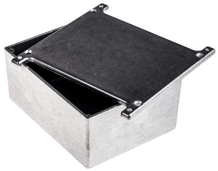 This is Alumimium Enclosure Flanged 119 x 93.5 x 56.5mm manufactured by RS Pro. The manufacturer part number is 146-5336. Flange Options - yes. Its external length includes 119 mm. It has a decent silver colour. The product's body is nicely designed from die cast aluminium materials. The lid has a classical black colour. Features 119 x 93.5 x 56.5mm external caliber. While its external height is 56.5 mm. The product is 93.5 mm wide.