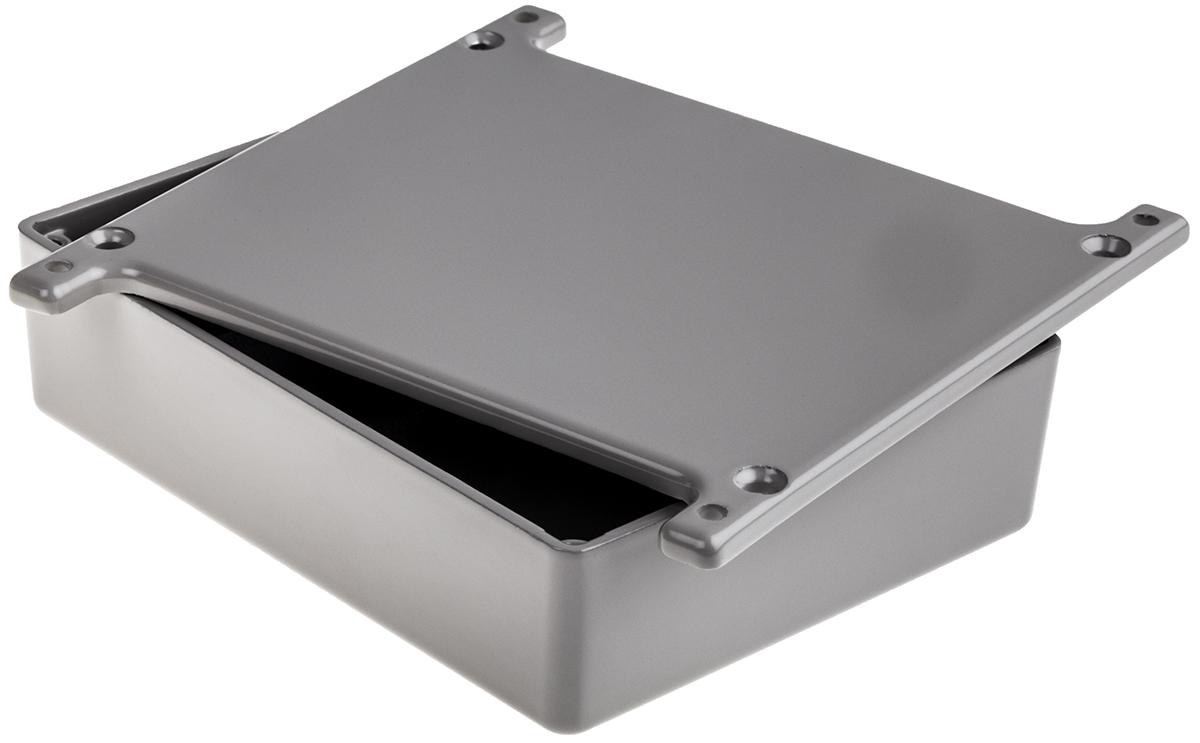 This is Alumimium Enclosure Flanged 119 x 93.5 x 34mm manufactured by RS Pro. The manufacturer part number is 146-5357. Flange Options - yes. Its external length includes 119 mm. It has a decent grey colour. The product's body is nicely designed from die cast aluminium materials. The lid has a classical grey colour. Features 119 x 93.5 x 34mm external caliber. While its external height is 34 mm. The product is 93.5 mm wide.