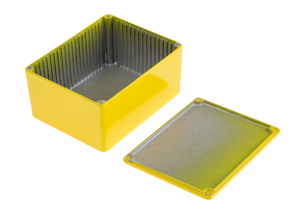 This is Aluminium Enclosure IP54 Shielded 121 x 95 x 61mm manufactured by RS Pro. The manufacturer part number is 158-5317. Flange Options - no. The typical product's weight is 284g. It is IP rated with ip54. Shielding Options yes. It has a decent yellow colour. Its external length includes 121mm. The product's body is nicely designed from die cast aluminium materials. The lid has a classical yellow colour. It has a transparent door no . Features 121 x 95 x 61mm external caliber. While its external height is 61mm. The product is 95mm wide. Additionally, it is explosion proof no .