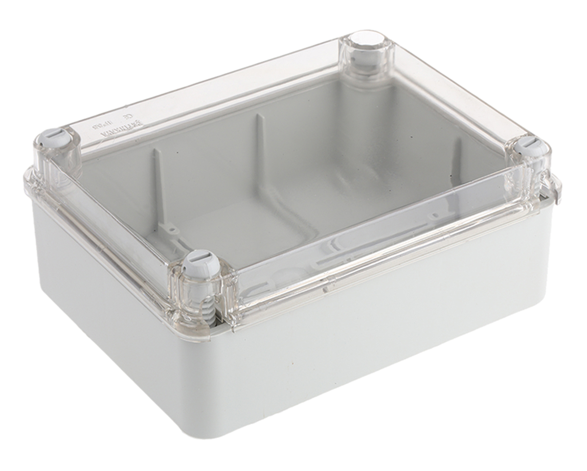 This is ABS Enclosure IP55 200 x 155 x 80mm manufactured by RS Pro. The manufacturer part number is 769-6134. Flange Options - no. The typical product's weight is 340g. It is IP rated with ip55. Shielding Options no. It has a decent grey colour. Its external length includes 155 mm. The product's body is nicely designed from abs materials. The lid has a classical grey colour. Features 200 x 155 x 80mm external caliber. While its external height is 200 mm. The product is 80 mm wide.