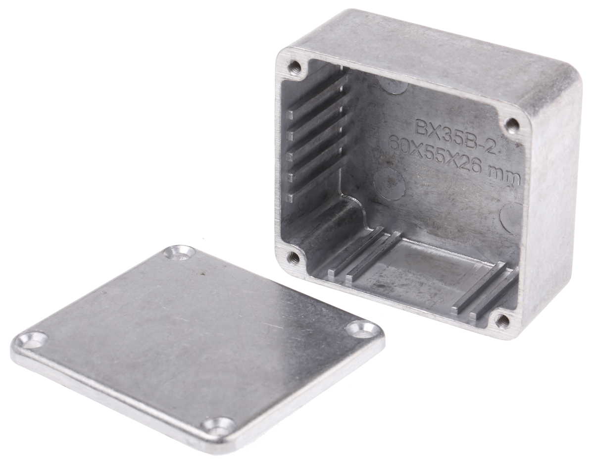This is Aluminium Enclosure IP66 Shielded 60 x 54.9 x 30mm manufactured by RS Pro. The manufacturer part number is 517-3513. Flange Options - no. Its gasket is made using neoprene material . It is IP rated with ip66. Shielding Options yes. It has a decent silver colour. Its external length includes 60 mm. The product's body is nicely designed from die cast aluminium materials. The lid has a classical silver colour. Features 60 x 54.9 x 30mm external caliber. While its external height is 30 mm. The product is 54.9 mm wide.