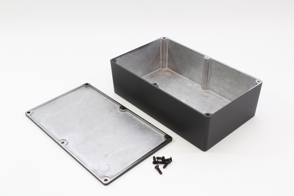 This is 1590 Die Cast Aluminium Alloy Enclosure IP54 Shielded 200 x 120 x 64mm manufactured by Hammond. The manufacturer part number is 1590DEBK. Flange Options - no. It is IP rated with ip54. Shielding Options yes. The product 1590, is a highly preferred choice for users. The product's body is nicely designed from die cast aluminium alloy materials. Its external length includes 200 mm. It features 1590 range. Features 200 x 120 x 64mm external caliber. While its external height is 64 mm. The product is 120 mm wide.