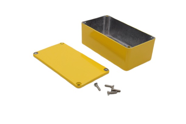 This is Die Cast Stomp Box - Yellow manufactured by Hammond. The manufacturer part number is 1590BSYL. Flange Options - no. It is IP rated with ip54. Shielding Options yes. The product 1590, is a highly preferred choice for users. Its external length includes 113 mm. The product's body is nicely designed from die cast aluminium materials. Features 113 x 113 x 42mm external caliber. While its external height is 42 mm. The product is 61 mm wide.