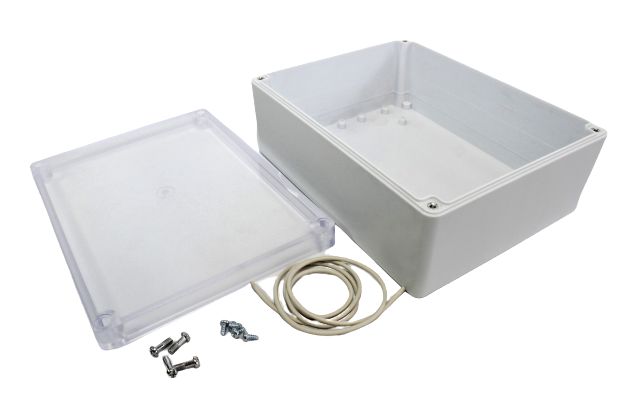 This is RP Series Light Grey Polycarbonate General Purpose Enclosure IP65 Clear Lid 186 x 146 x 75mm manufactured by Hammond. The manufacturer part number is RP1280C. Flange Options - no. It is IP rated with ip65. Its external length includes 186 mm. The product rp, is a highly preferred choice for users. It has a decent light grey colour. The product's body is nicely designed from polycarbonate materials. The lid has a classical clear colour. While its external height is 75 mm. The product is 146 mm wide. Features 186 x 146 x 75mm external caliber.