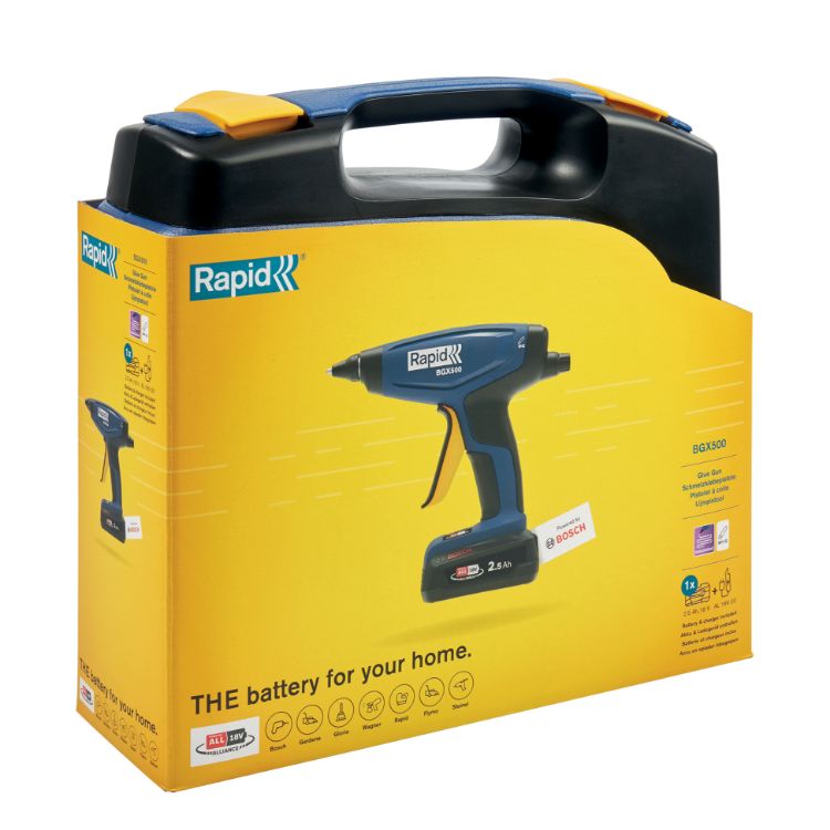 This is 193mm Cordless Glue Gun Euro Plug manufactured by Rapid. The manufacturer part number is 5001514. The cord is a type of cordless . The plug is a highly reliable type c - euro plug with long service life. It has a glue stick size about 193mm . Additionally, the product is cordless . It comes in glue guns configuration. It has a model bgx500.