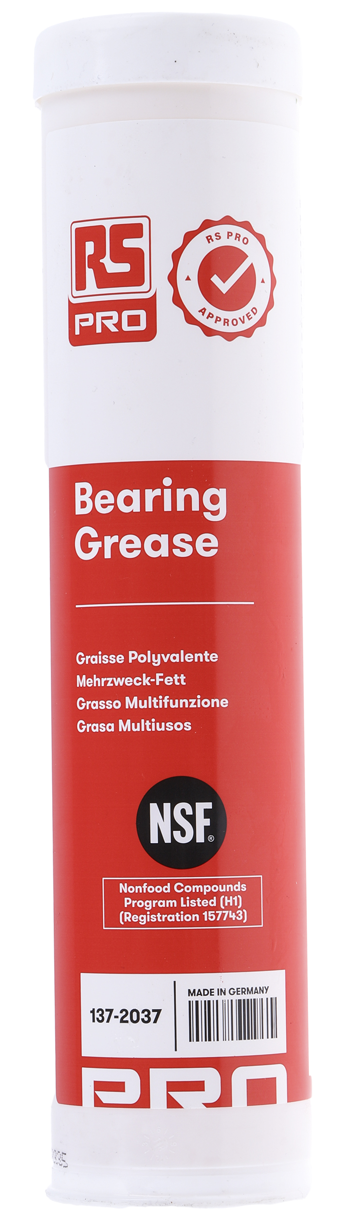This is Bearing grease 380g manufactured by RS Pro. The manufacturer part number is 137-2037. The product is food processing safe yes . The product is in grease form . It has a decent translucent colour. The package is a sort of cartridge. Whereas, the minimum operating temperature of the product is -15°c. Its package size is approximately 380 g . It has a maximum operating temperature of +135°c. It contains aluminium complex type grease . Moreover, it has 2 NGLI grade .