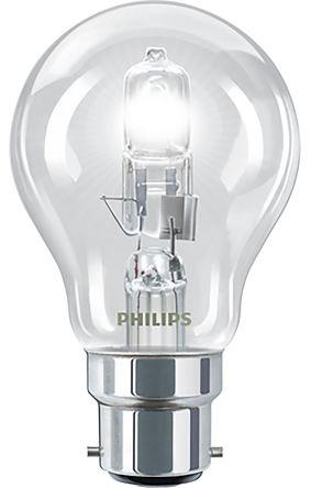 This is 42 W Clear GLS Halogen Bulb B22 240 V 56mm manufactured by Philips. The manufacturer part number is 42BCECOCLASA55. Its diameter is 56mm. The product has a current rating of 180 ma. Moreover, the product has a nominal 240 v voltage rating. Features luminosity up to 630 lm. This product carries 42 w. It has clear lamp finish . In addition, it has about 55w incandescent equivalent wattage . The lamp base is bc / b22d. Its accurate length is 95.5 mm. It includes a/an bulb shape lamp . Adding to this, it has a long life span for about 2000h.