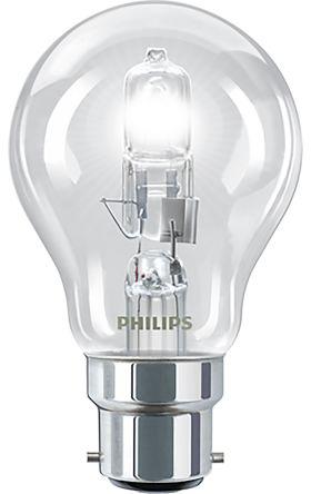 This is 28 W Clear GLS Halogen Bulb B22 240 V 56mm manufactured by Philips. The manufacturer part number is 28BCECOCLASA55. Its diameter is 56mm. The product has a current rating of 120 ma. Moreover, the product has a nominal 240 v voltage rating. Features luminosity up to 370 lm. This product carries 28 w. It has clear lamp finish . In addition, it has about 35w incandescent equivalent wattage . The lamp base is bc / b22d. Its accurate length is 95.5 mm. It includes a/an bulb shape lamp . Adding to this, it has a long life span for about 2000h.
