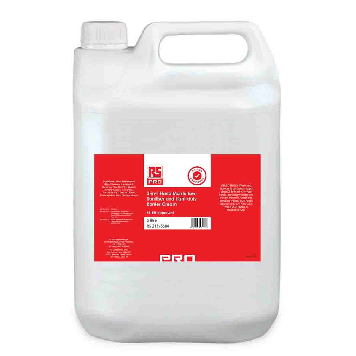 This is Hand Protection Hand Sanitiser Moisturiser and Barrier Cream - 5 L Bottle manufactured by RS PRO. The manufacturer part number is 219-3684. The product's category is barrier cream, hand cream . It has 1 bottle(s) included . Applications Information involves hand protection. The package is a sort of bottle. In addition, it exhibits a/an unscented fragrance . Its package size is approximately 5 l .