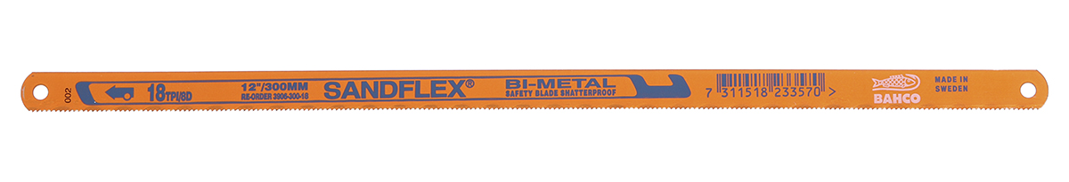 The Bahco 3906-300-18-10P Hacksaw Blade is a high-performance cutting tool, sold in a pack of 10, engineered for professional use across a variety of materials. Measuring 300 mm in length and 13 mm wide, this blade features 18 Teeth Per Inch (TPI), providing an excellent balance between speed and precision for general-purpose cutting. It is manufactured from robust Spring Steel, a material chosen for its flexibility and durability, allowing the blade to withstand considerable stress without breaking. This blade is the optimal choice for tradesmen requiring reliable and long-lasting blades for their hacksaws to cut multiple types of metal and plastic.