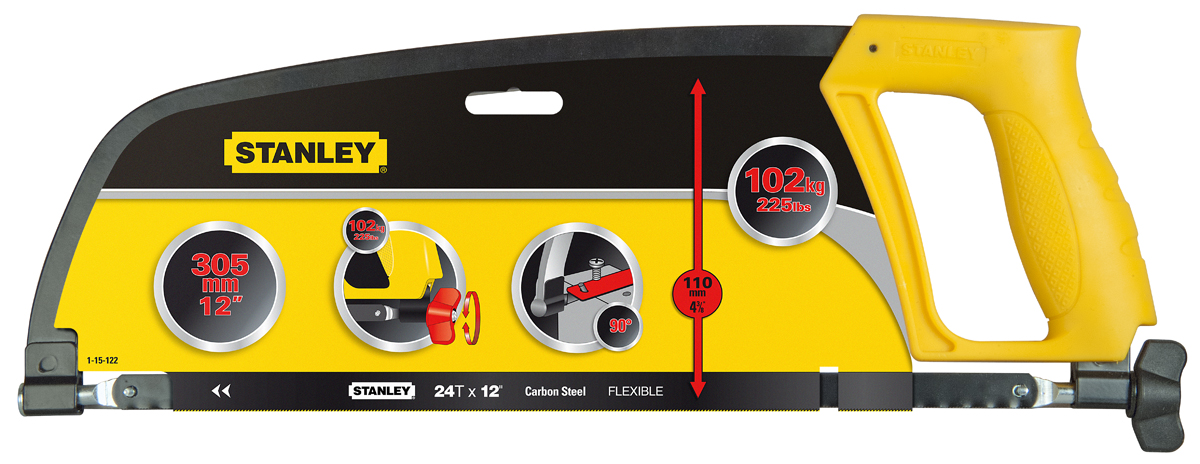 This is 300 mm Hacksaw with Steel Blade and Moulded Handle 24 TPI manufactured by Stanley FatMax. The manufacturer part number is 1-15-122. The blade has a length of 300 mm. It has 24 number of teeth per inch . It is created with a hacksaw . In addition, its blade is made up of steel material .
