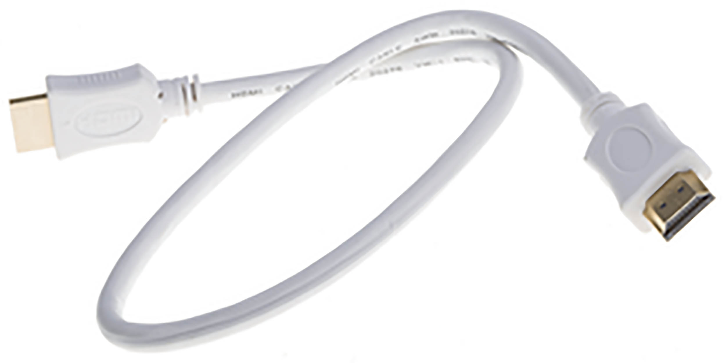 This is Male HDMI Plug to Male HDMI Plug HDMI Cable 0.5m HDMI manufactured by RS Pro. The manufacturer part number is 121-6591. Connector 2 is a male connector. The sheath has an adorable white colour. Its accurate length is 0.5m. While the Connector 2 is hdmi. Connector 1 is hdmi.