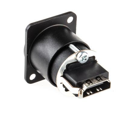 This is standard 19 Way Female HDMI Connector manufactured by Neutrik. The manufacturer part number is RSNAHDMI-W-B. The product contains 19 contacts. Whereas, the minimum operating temperature of the product is -25°c. In addition, female is the available "Gender" of the product. It has a decent black colour. The product also features robust die cast zinc housing material. The high-quality gold is used as contact plating material. It allows feed through termination method. The product is made from sturdy brass materials. It has a maximum operating temperature of +85°c. It has straight body orientation. The product is available in standard size.
