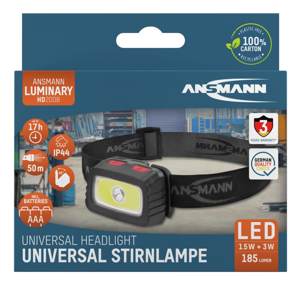 This is Headlight HD200B manufactured by Ansmann. The manufacturer part number is 1600-0198. Moreover, it is rechargeable yes . It is IP rated with ip44. Features luminosity up to 185lm. It has a decent black colour. It features 50 m range. Its beam type is spot to flood . It includes a standard aaa batteries . It has a model number hd200b. Its overall weight with batteries is 94g . It is a type of led lamp. The casing is constructed from highly stable abs, plastic material.