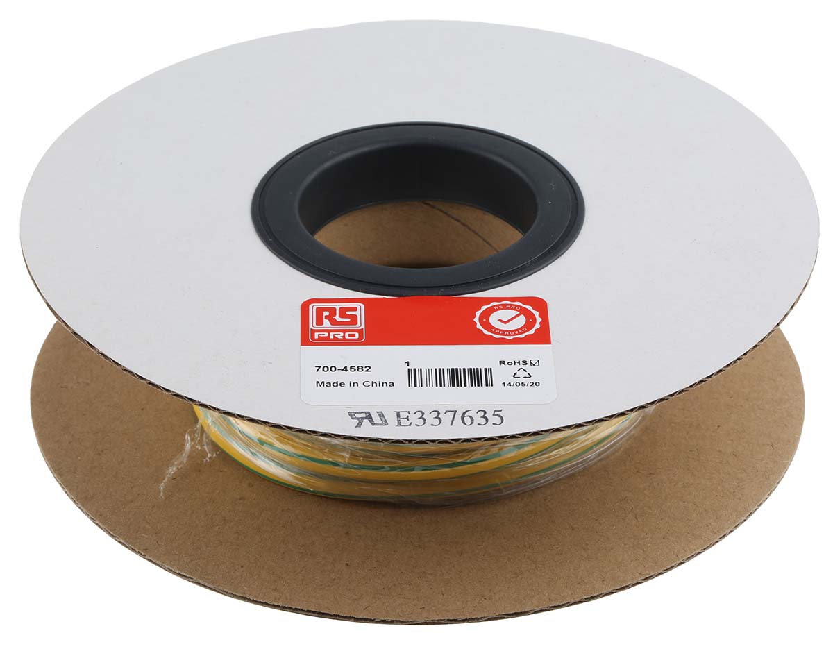 This is Green/Yellow Heat Shrink Tubing 3:1 3mm Sleeve Dia. x 10m manufactured by RS Pro. The manufacturer part number is 700-4582. Its adhesive is lined no . The product complies with all safety standards, such as ul. It has a 3mm diameter. It has a decent green, yellow colour. The product is made from highly stable and reliable polyolefin. It is halogen free no . This heat shrink sleeve offers extreme flexibility and suit various settings. Moreover, its overall shrunk diameter is 1mm . The sleeve has a 10m length. Its shrink ratio is about 3:1 . It is flame retardant yes .
