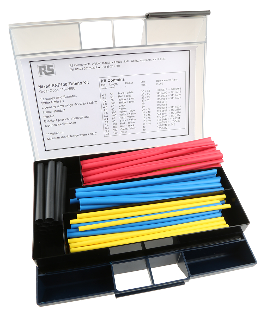 This is Black 2:1 Heat Shrink Tubing Kit 2.4 mm 3.2 mm 4.8 mm 6.4 mm 9.5 mm Sleeve Dia. manufactured by TE Connectivity. The manufacturer part number is RNF 100 KIT. Its adhesive is lined no . The product complies with all safety standards, such as rohs compliant. It has a 2.4 mm, 3.2 mm, 4.8 mm, 6.4 mm, 9.5mm diameter. The product has -55 → +135 °c of operating temperature range. The product rnf-100, is a highly preferred choice for users. It has a decent black colour. The product is made from highly stable and reliable polyolefin. This heat shrink sleeve offers extreme flexibility and suit various settings. Moreover, its overall shrunk diameter is set . The sleeve has a set length. Its shrink ratio is about 2:1 . It is flame retardant yes .